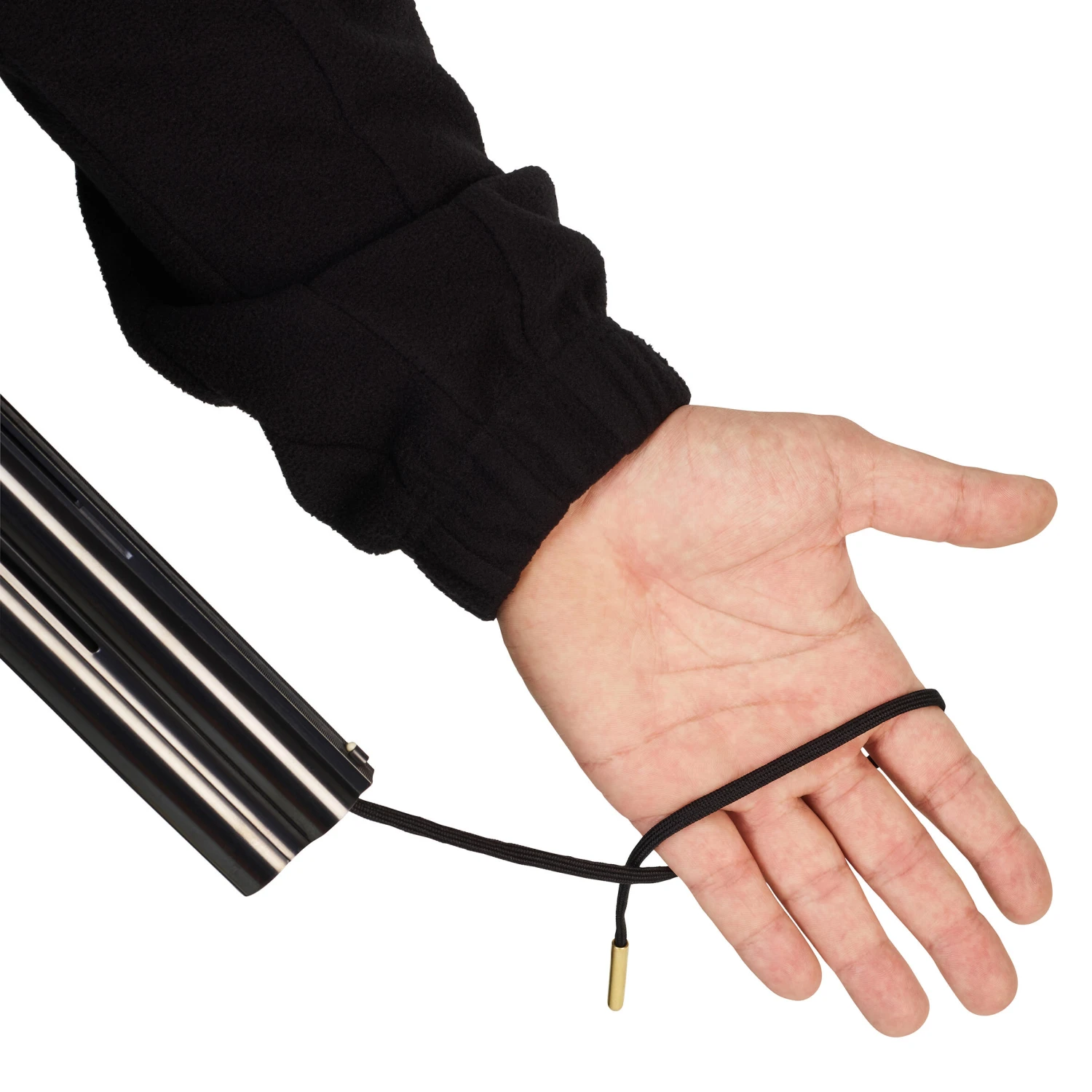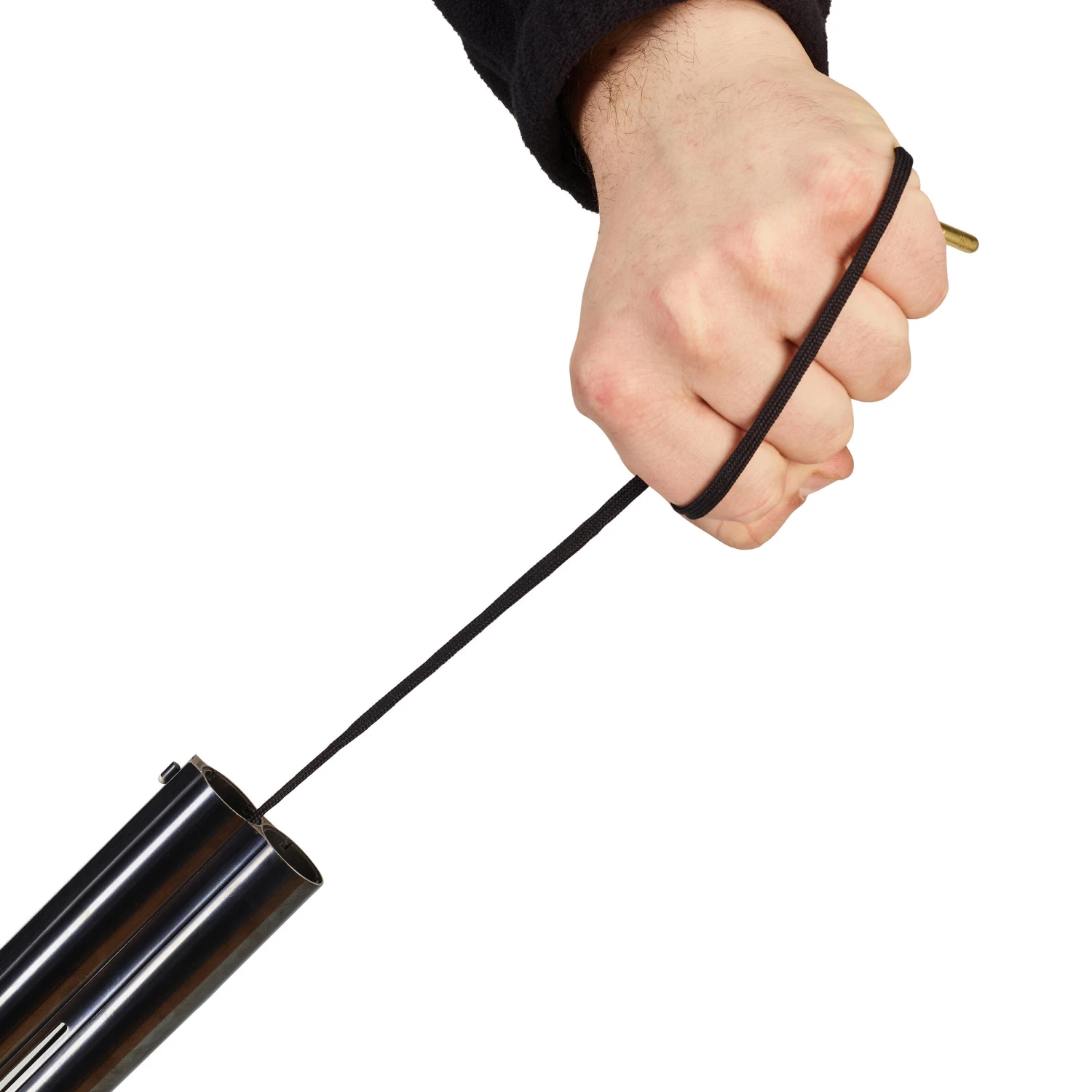 For the first use, insert the weight (the metal part) into the barrel chamber and let it fall with gravity and retrieve it at the muzzle. We recommend you wrap your cord around an object that lets you pull it, aligned with the barrel, without hurting your hands.