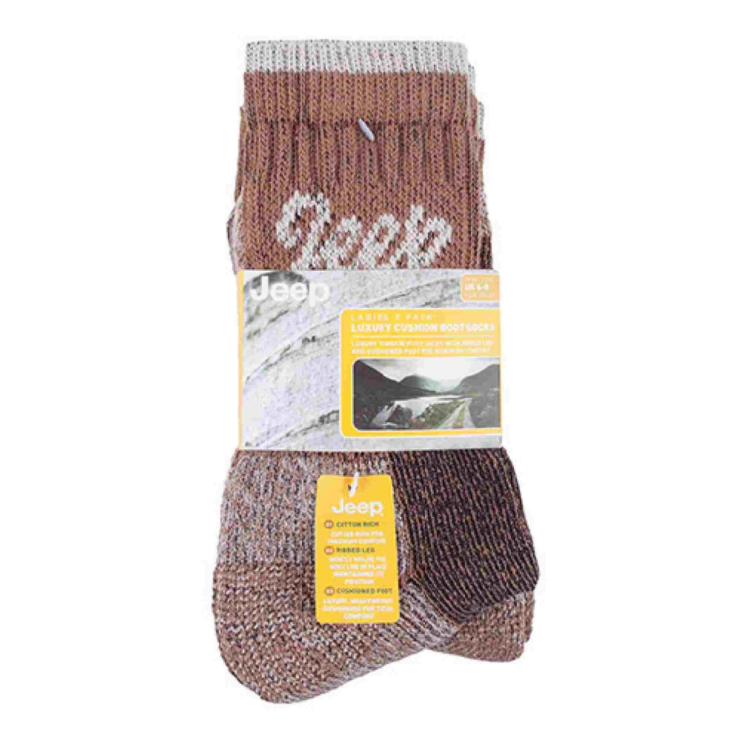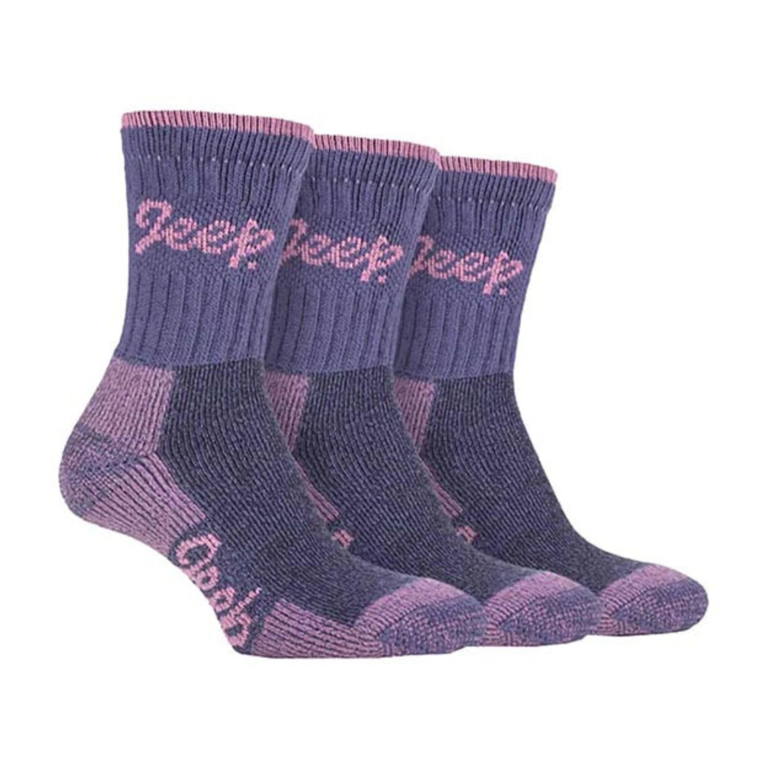 These socks are available in a 3 pair pack and are a ladies standard size of 4-7 UK 5-8 US and 37-42 EU. They are available in 4 different colours, regenerated with a refreshed touch compared to the old Jeep Terrain colours and are made from 80% cotton 17% polyester 2% elastane and 1% nylon. They are safely machine washable.