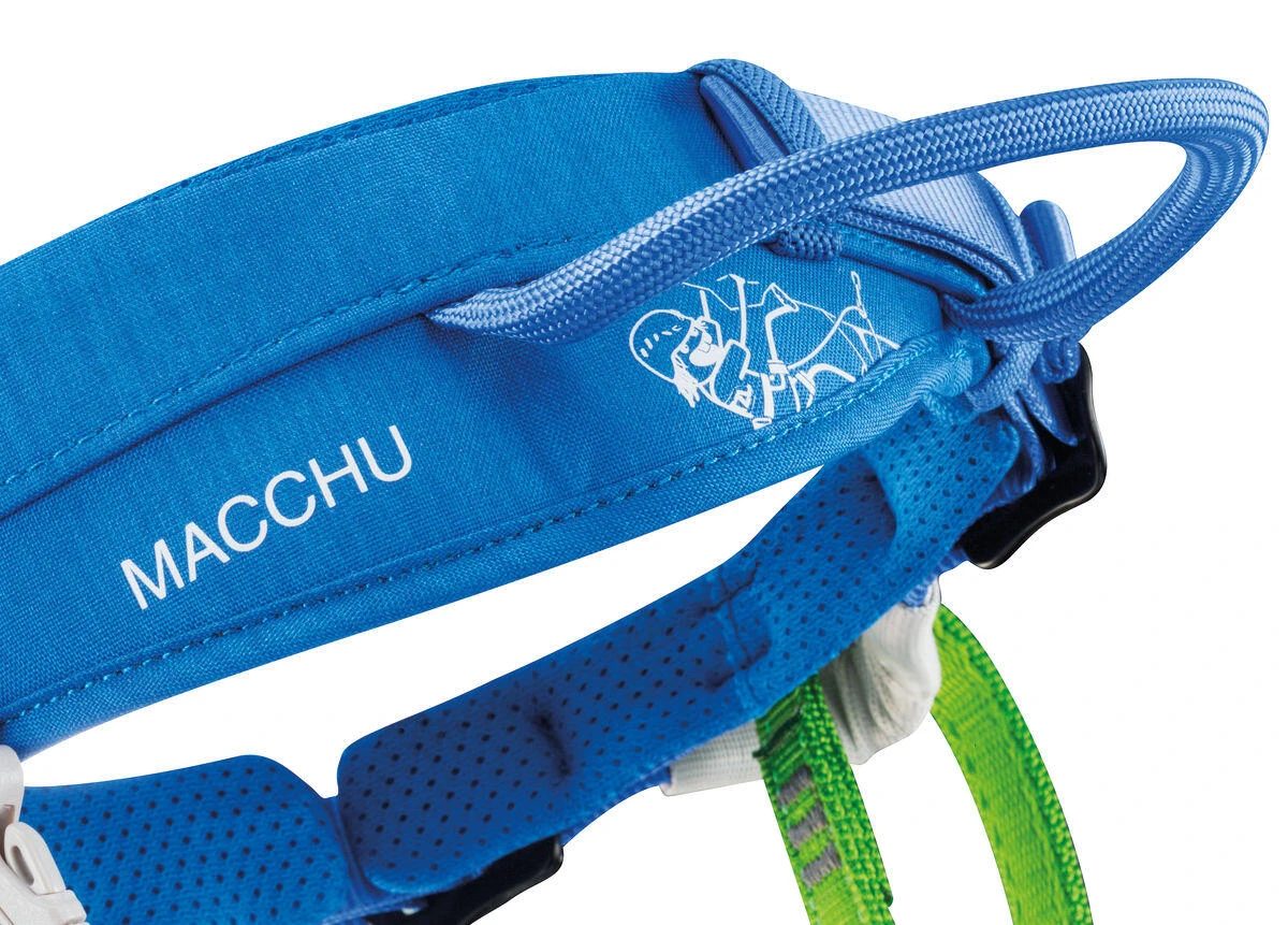 It can adapt as your child grows! MACCHU is an adjustable sit harness for children less than 40 kg. The harness has a wide range of adjustability, allowing it to grow with your child, adapting to their size. For small children, it’s possible to add BODY shoulder straps, converting it into a full-body harness. With padded waistbelt and leg loops, it is very comfortable when hanging. The waistbelt buckles allow you to properly position the tie-in points, and the attachment loop is a different color for rapid visual inspection of the belay system connection point. It also has two gear loops and an accessory loop for a chalk bag, to be just like the grown-ups. Adjustable sit harness for children less than 40 kg: