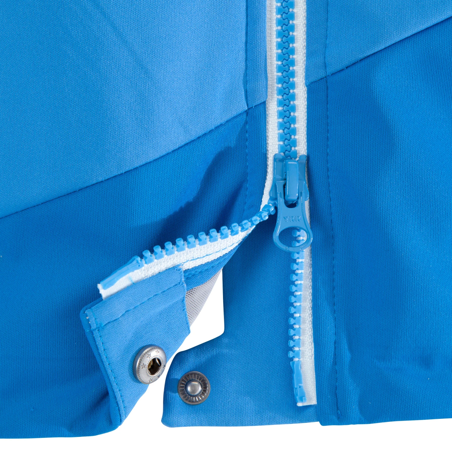 Snap fastener added to jacket bottom to close it when zip is pulled up.