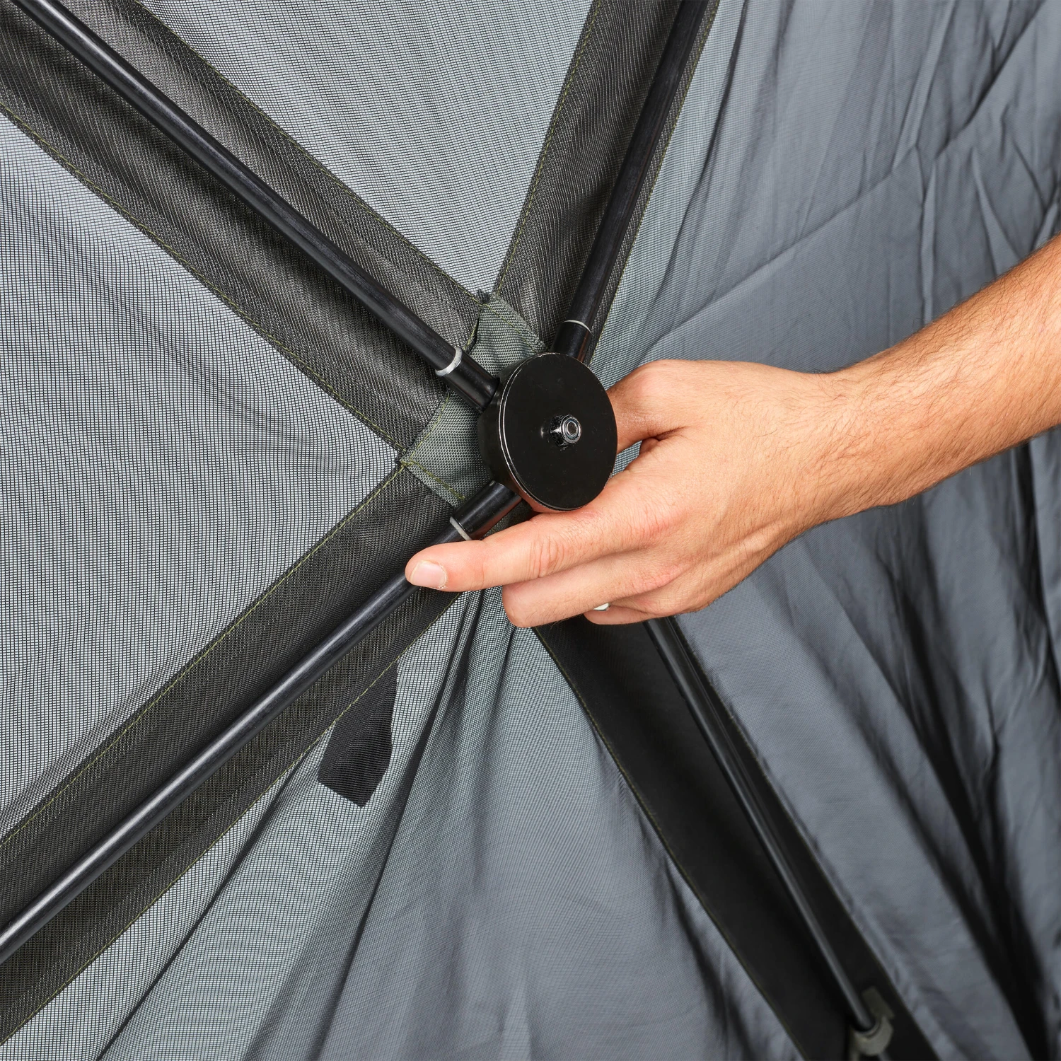 Each panel has a flexible central handle that can be used to tension the rings. This means that simply by pulling on the handle of each panel (4 side panels + one ceiling panel = 5 handles = 5 pulls), just a few seconds suffice to assemble the self-supporting structure of the Social Bivvy.
