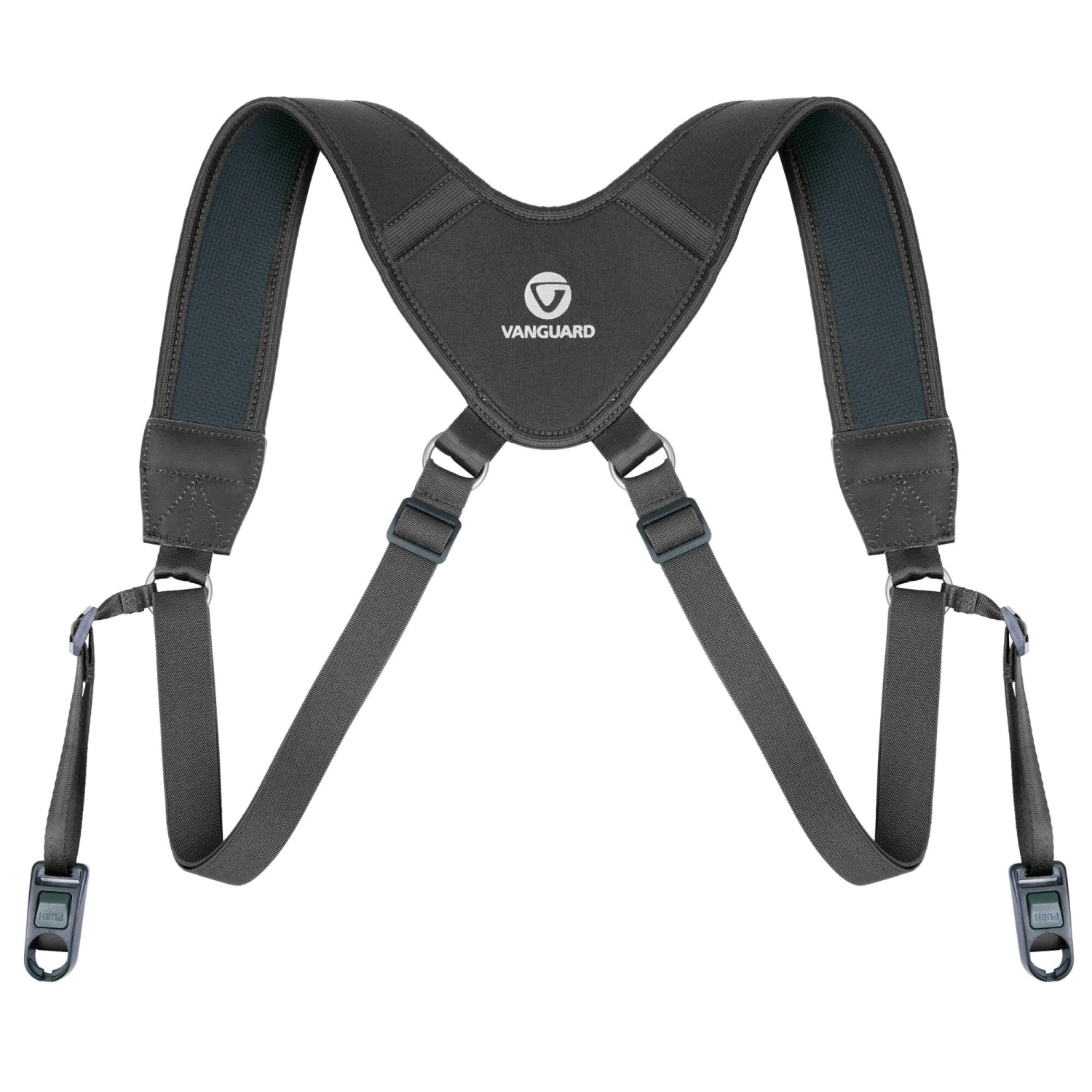 Delux black binocular/camera harness with VEO Optic Guard’s quick release system so you can choose and fit the right harness for your trip in seconds