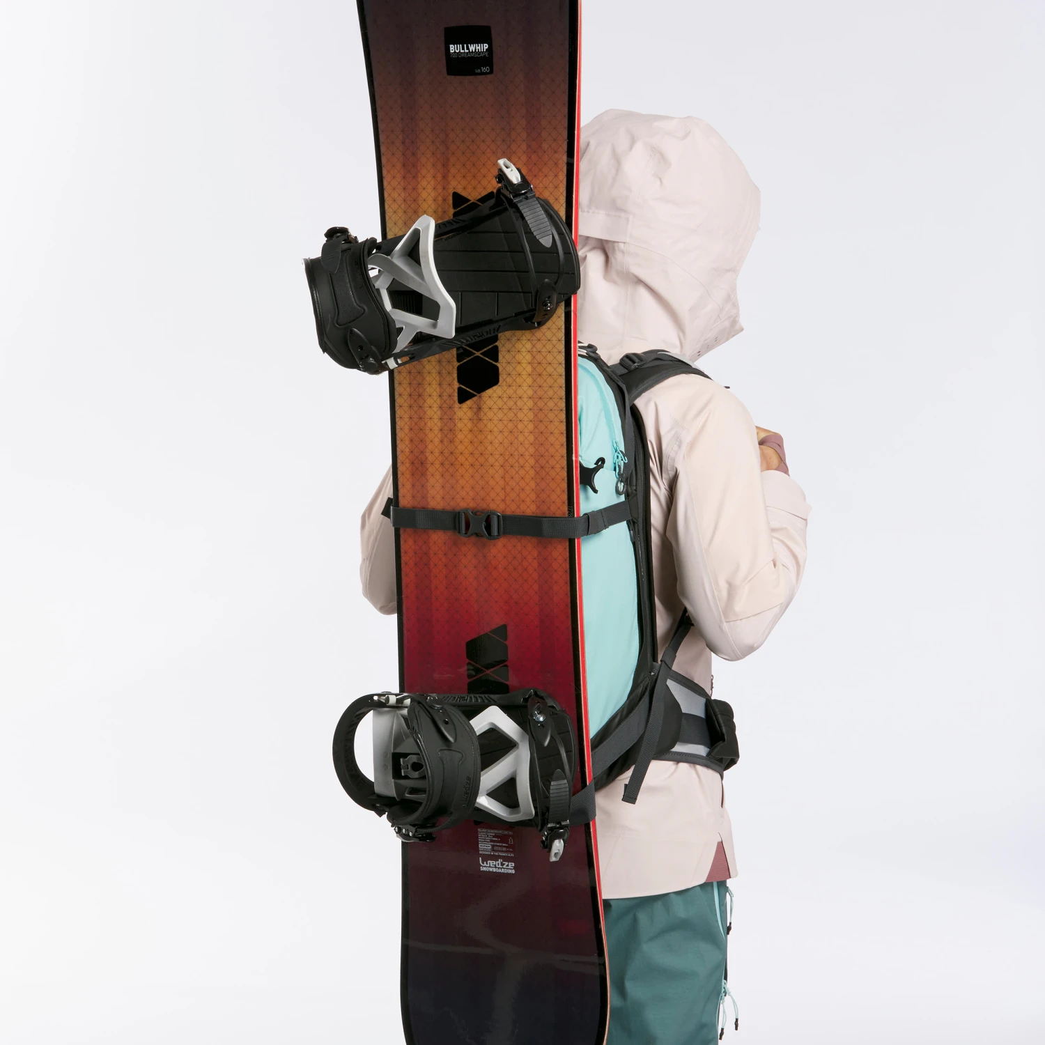You can carry a snowboard on the front of the bag or adult skis, one on either side, or two pairs of junior skis on either side.