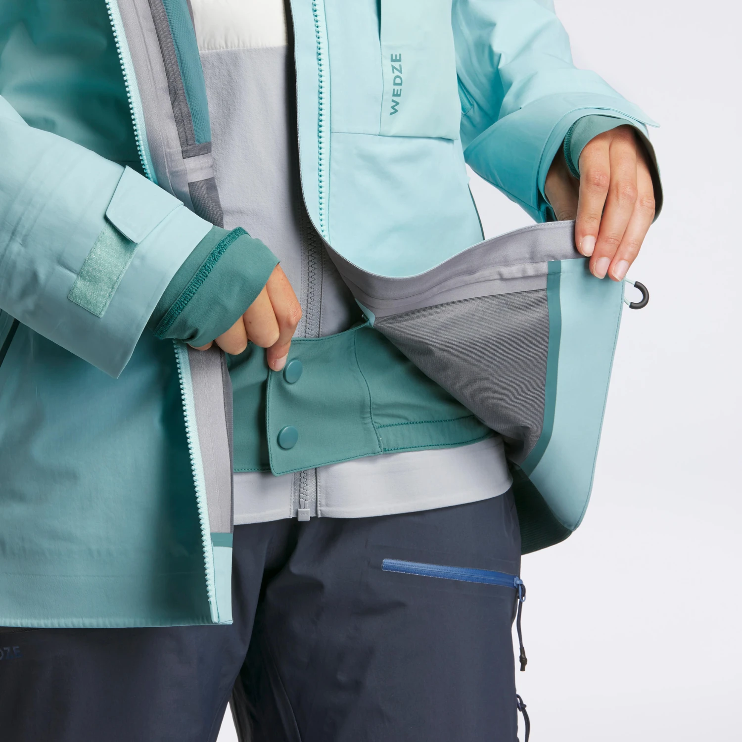 The snow skirt is a protection system at waist level that closes with press studs at the bottom of the ski or snowboard jacket. It prevents snow and draughts from entering when practicing wintersports, especially in the event of a fall. It can be fastened to the trousers using the 3 loops with a press stud.